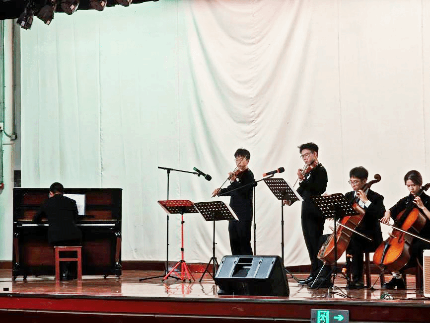 最后,沈子翔、陈泽西、蒋睿希、肖雅瑄同学和刘佳丹、谭文博老师带来一首精心编排的歌曲串烧《晴天》+《always online》+《我怀念的》。在场的同学纷纷上台加入这场温暖人心的大合唱,留在舞台下的同学也一起打开手机手电筒打着节奏,将自己的热情融入这场青春的合鸣。歌声、光影、笑脸在此刻交织,仿佛为这个独特的夜晚,画上了一个既圆满、又令人无限回味的句点。
