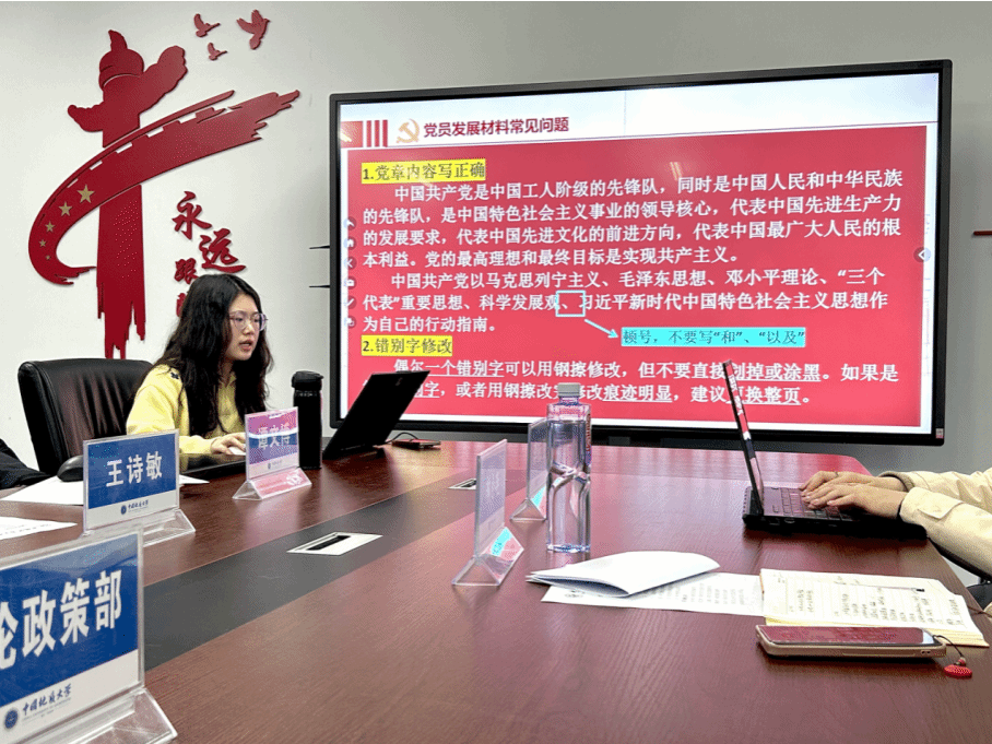 进入党建工作分享交流环节。首先,兼职辅导员王诗敏详细分享了发展对象材料撰写过程中需要注意的重点内容、常见问题及规范要求,重点强调了材料撰写的规范性、真实性和完整性。